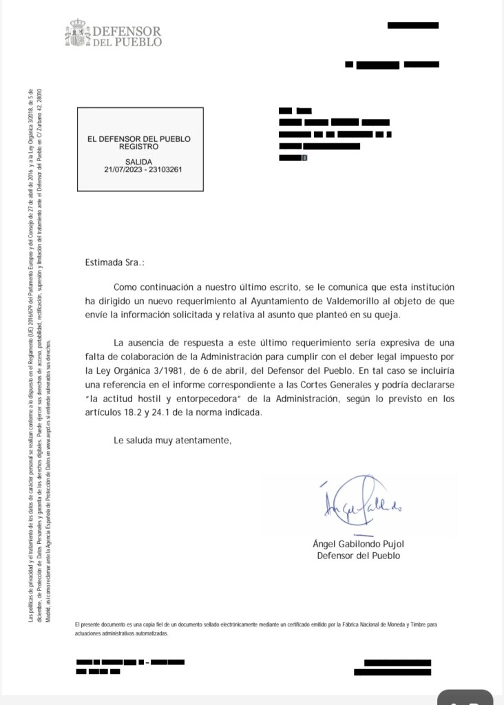 El Defensor anticipa que, de persistir en su silencio ante el último requerimiento remitido, incluirá una referencia negativa sobre el ayuntamiento de Valdemorillo en el informe anual que eleva a las Cortes Generales, y podría (¡agárrate!) declarar su “actitud hostil y entorpecedora”.